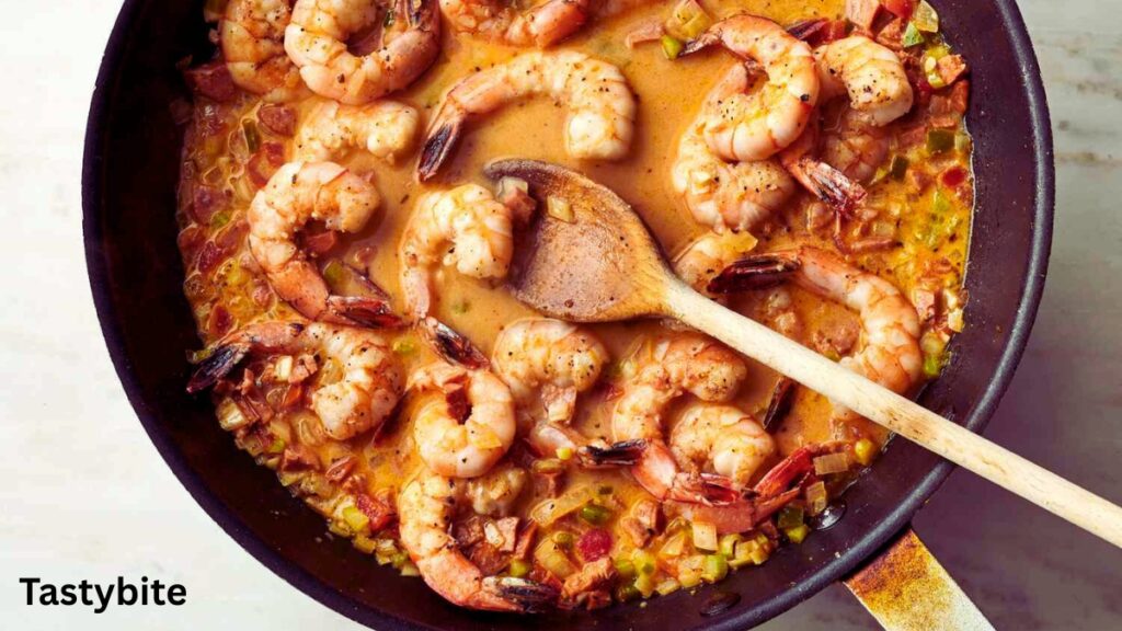 Peel and devein the shrimp, reserving shells for extra flavor, then cook the shrimp in the sauce until pink, tender, and fully cooked, occasionally coating them evenly while stirring gently.